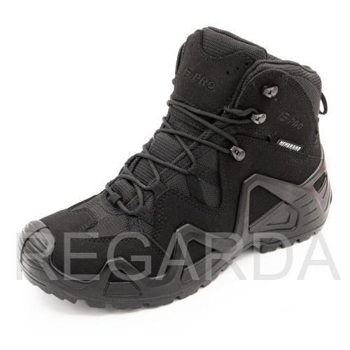 Серия обуви E-PRO — это одна из самых популярных в туристической и тактической обуви, используемая походниками, альпинистами, спортсменами, военными и сотрудниками правоохранительных органов. Линейка E-PRO Special представлена целым семейством моделей, отличающихся по цвету, высотой берца, а также наличием мембраны. Основной материал изготовления — высококачественная замша со вставками из кордуры. Наличие подкладки из мембраны делает обувь непромокаемой и одновременно дышащей, способной отводить испарения с поверхности стопы. Подлитой носок обеспечивает защиту от повреждений. Защитный рант с выборками для облегчения веса проходит по всему периметру и создает узнаваемый образ. Кроме основных функций, рант дает дополнительное сцепление с поверхностью, например, при движении вдоль склона. Высота среднего ботинка 14.5 см, этого хватает для отличной фиксации голеностопа. Все детали прошиты двойным швом, все швы сделаны крайне аккуратно. На пятке есть петелька, облегчающая надевание. Подошва имеет многослойную структуру. Промежуточный слой из полиуретана придает высокие амортизирующие свойства; ходовой слой из резины на основе натурального каучука делает подошву более износостойкой и способствует хорошему сцеплению с грунтом и другими плоскостями. Язычок с защитным клапаном исключает просачивание воды и попадание посторонних предметов внутрь.