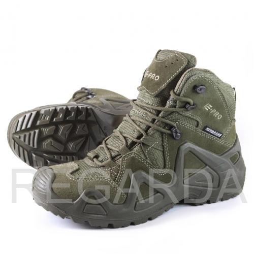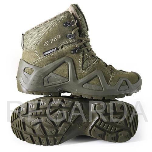 Серия обуви E-PRO — это одна из самых популярных в туристической и тактической обуви, используемая походниками, альпинистами, спортсменами, военными и сотрудниками правоохранительных органов. Линейка E-PRO Special представлена целым семейством моделей, отличающихся по цвету, высотой берца, а также наличием мембраны. Основной материал изготовления — высококачественная замша со вставками из кордуры. Наличие подкладки из мембраны делает обувь непромокаемой и одновременно дышащей, способной отводить испарения с поверхности стопы. Подлитой носок обеспечивает защиту от повреждений. Защитный рант с выборками для облегчения веса проходит по всему периметру и создает узнаваемый образ. Кроме основных функций, рант дает дополнительное сцепление с поверхностью, например, при движении вдоль склона. Высота среднего ботинка 14.5 см, этого хватает для отличной фиксации голеностопа. Все детали прошиты двойным швом, все швы сделаны крайне аккуратно. На пятке есть петелька, облегчающая надевание. Подошва имеет многослойную структуру. Промежуточный слой из полиуретана придает высокие амортизирующие свойства; ходовой слой из резины на основе натурального каучука делает подошву более износостойкой и способствует хорошему сцеплению с грунтом и другими плоскостями. Язычок с защитным клапаном исключает просачивание воды и попадание посторонних предметов внутрь.
