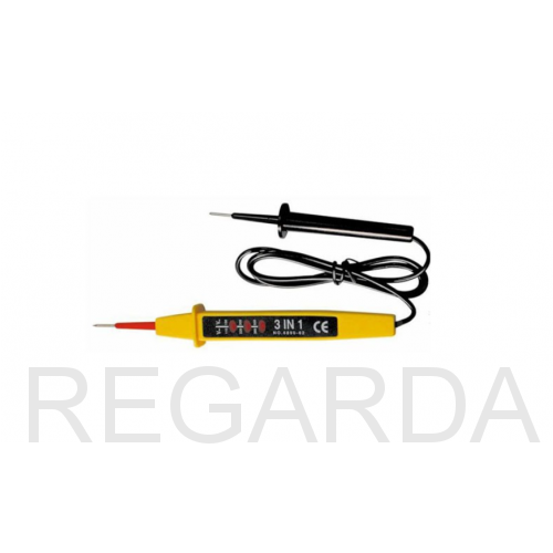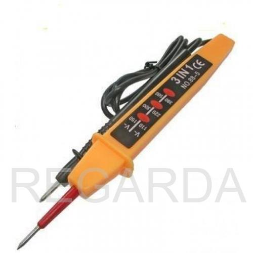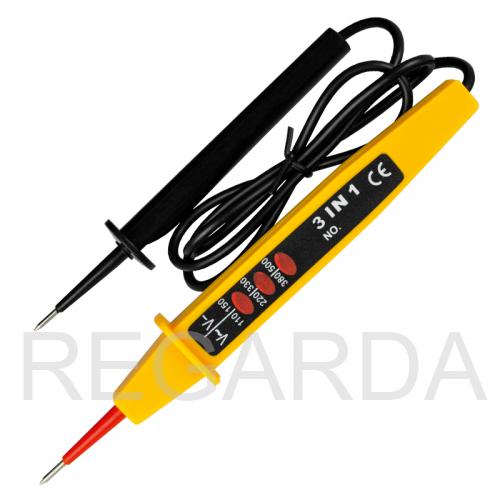 Тестер напряжения 6890-62 (3 в 1) используется для безопасной ступенчатой индикации напряжения электропитания и химических источников питания типа AA, AAA, C, D. Устройство выполнено в плоском пластмассовом корпусе с заизолированным конусным щупом. К тестеру прикреплен провод со вторым щупом. Этот тестер не определит обрыв электрической цепи. Индикаторами служат неоновые лампы.