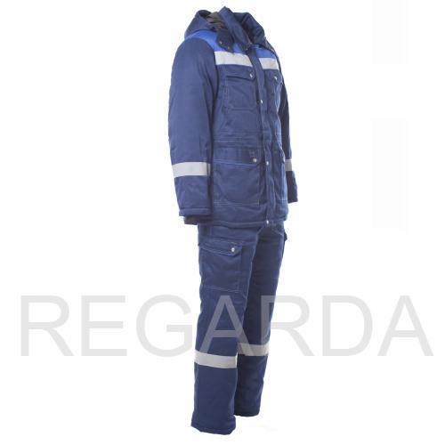 Костюм "АНТЕЙ" изготовлен в соответствии с ГОСТ и включает в себя два предмета: куртка / полукомбинезон. Он оснащен утепленной ветрозащитной планкой с застежкой на кнопки, которая обеспечивает дополнительную защиту от ветра. В костюме используется контрастная отстрочка. На модели расположены накладные карманы с клапанами, которые закрываются на кнопку. Воротник отложный, капюшон утепленный и съемный. Ширина изделия регулируется по талии куртки. Полукомбинезон с центральной застежкой на молнию. На спине вдоль линии талии есть эластичная резинка. Для безопасной работы сотрудника в местах с плохим освещением на костюме «Антей» предусмотрена световозвращающая полоса шириной 50 мм.