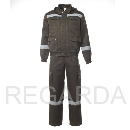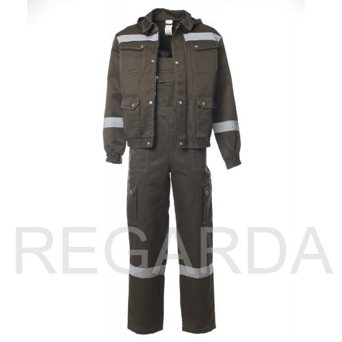 Костюм "АНТЕЙ" изготовлен в соответствии с ГОСТ и включает 2 предмета: куртка/полукомбинезон. Костюм с контрастной отстрочкой. На изделии расположены верхние накладные карманы с фигурными клапанами и перекантом на кнопках, нижние карманы с полуобъемом, с фигурными клапанами и перекантом на кнопках. Модель куртки представлена в укороченном варианте на поясе с частичной стяжкой на эластичной резинке. Куртка оснащена съемным капюшоном на пуговицах с регулировкой объема по лицевой части. На полукомбинезоне расположены многофункциональными карманы для хранения мелочей Эластичная резинка по талии спинки фиксирует посадку. Гульфик застегивается на молнию и застежку в правом боковом шве. Для безопасной работников в костюме "АНТЕЙ" предусмотрена световозвращающая полоса шириной 50 мм.