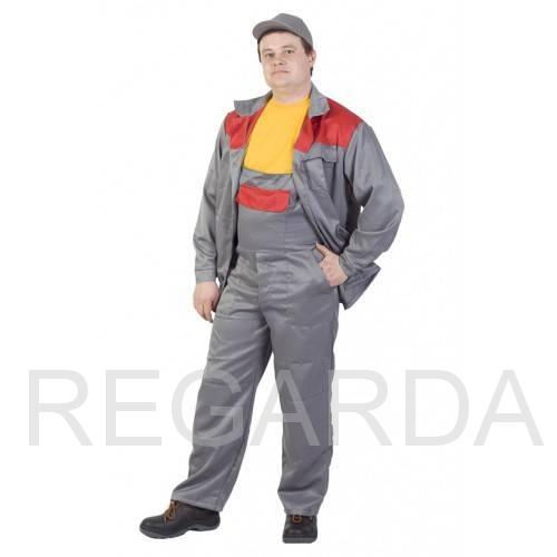 Состоит из куртки и полукомбинезона. Куртка прямая, с застежкой на пуговицы, с двумя нижними и одним верхним накладными карманами. Кокетка куртки выполнена из контрастной ткани. Рукава с защитными накладками в области локтей. Полукомбинезон с передними карманами и защитными накладками в области колен.