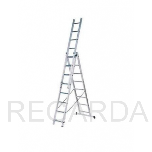 Корпус с антикоррозийным покрытием, изготовлен из алюминия. Благодаря пластиковым наконечникам ножек лестница не скользит по поверхности. Модель компактная, удобно хранить благодаря механизму трансформации. Поперечная траверса надежно фиксирует лестницу на поверхности.