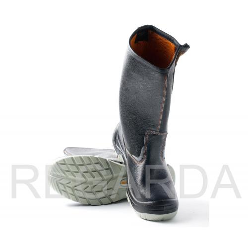 Сапоги «МИСТРАЛЬ-ULTRA» изготовлены методом литья к заготовке верха обуви. Подошва – двухслойная ПУ-ТПУ, устойчивая к воздействию нефти, нефтепродуктов, кислот и щелочей концентрации до 20%, повышенных и пониженных температур. Модель обладает улучшенным сопротивлением скольжению, стойкостью к деформациям, истиранию. Голенище выполнено из искусственной кожи. Для защиты от ударов в носочной части стопы применяется композитный подносок (Мун 200), имеющий конфигурацию, препятствующую надавливанию верхнего края на стопу и оборудованный прокладкой из полиуретана. Обувь изготавливается с проколозащитными прокладками (стельками) из металла, обеспечивающими защиту от проколов и порезов с сопротивлением сквозному проколу пакета деталей низа обуви не менее 1200 Н.