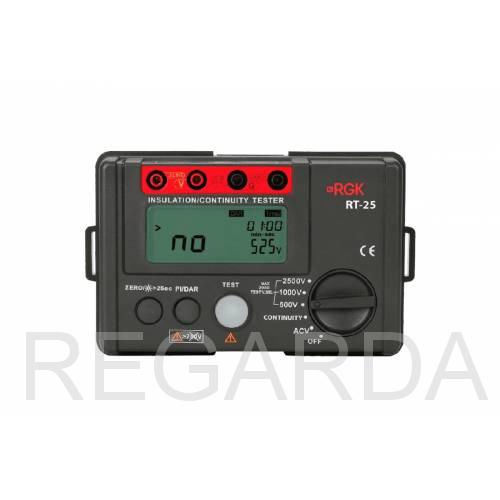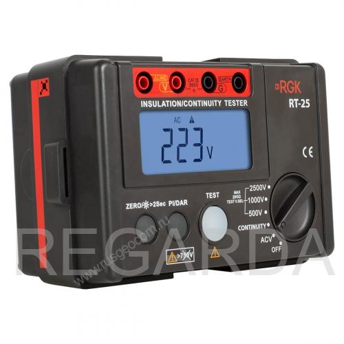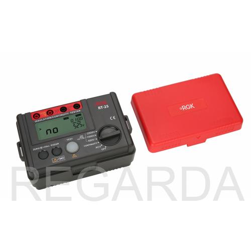 Мегаомметр RGK RT-25 776523 предназначен для оценки качества изоляции. Используется в процессе диагностики и ремонта электрооборудования, элементов энергосистем, трансформаторов, электродвигателей.
