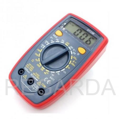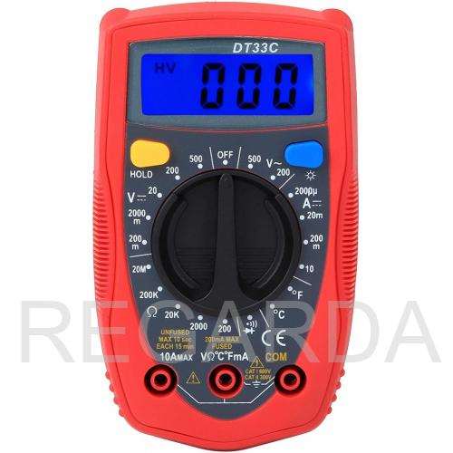 Портативный безопасный цифровой мультиметр DT33C с ЖК дисплеем, имеющий разрешение 3 ½ разряда, который предназначен для измерения постоянного и переменного напряжения, постоянного и переменного тока, сопротивления, температуры, тестирования транзисторов, а также прозвона цепи на обрыв