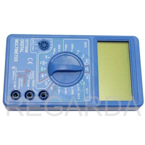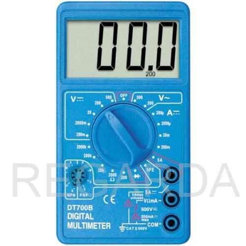 Цифровой мультиметр DT700B применяется для измерения постоянного, переменного напряжения, постоянного тока, сопротивлений, проверки диодов и транзисторов. Для комфортного использования оснащен большим дисплеем с крупными цифрами.Прибор оснащен защитой от перегрузки на всех пределах измерений и индикацией разряда батаре.