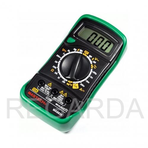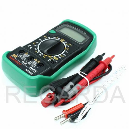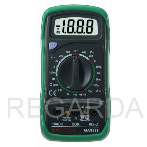 Цифровой мультиметр Mastech MAS838 57762 - компактное устройство для измерения постоянного/переменного напряжения, постоянного тока, сопротивления, температуры, коэффициента усиления транзисторов. Также он имеет режим "прозвонка" и диод-тест. Прибор совершает 2-3 измерения в секунду. Малый вес способствует комфортной работе. Модель работает от 1 батарейки 9 В типа "Крона".