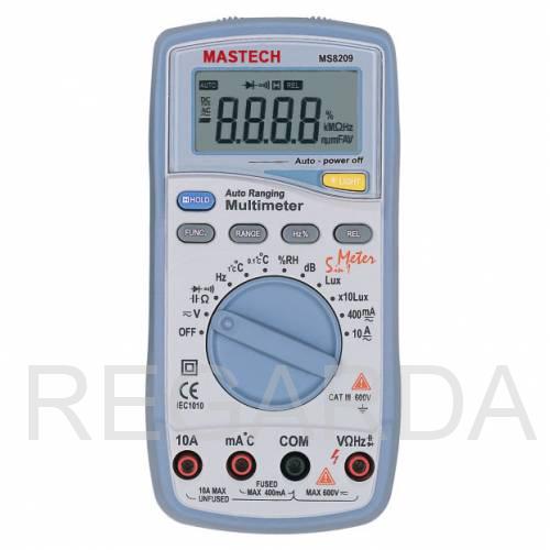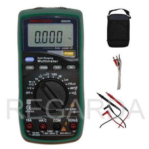 Профессиональный мультиметр MS8209 с автовыбором диапазонов. Революционный по своим возможностям цифровой мультиметр объединяет в себе сразу пять измерительных приборов с отличными характеристиками. Помимо основных функций мультиметра (измерения величин силы постоянного и переменного тока, постоянного и переменного напряжения, сопротивления), MS8209 позволяет измерять температуру, влажность, уровень звукового поля и уровень внешней освещенности. С помощью цифрового мультиметра MS8229 можно тестировать полупроводниковые диоды и прозванивать электрические цепи.