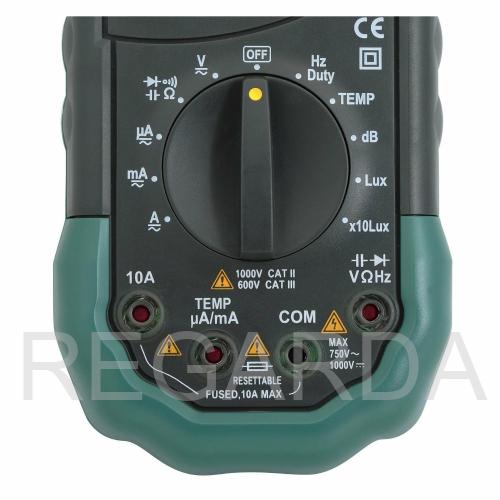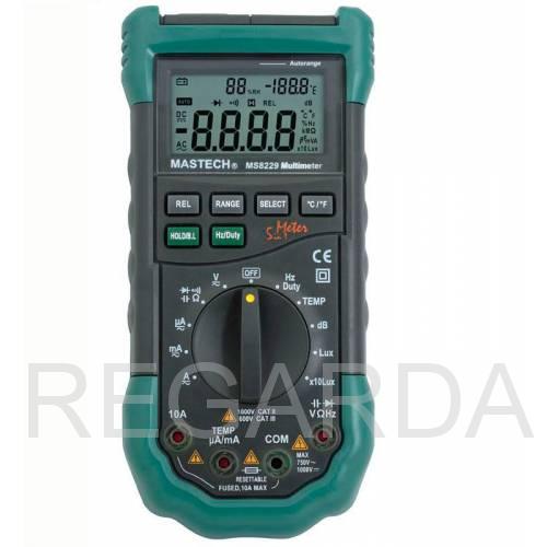 Революционный по своим возможностям цифровой мультиметр объединяет в себе сразу пять измерительных приборов с отличными характеристиками. Помимо основных функций мультиметра (измерения величин силы постоянного и переменного тока, постоянного и переменного напряжения, сопротивления), MS8229 позволяет измерять температуру, влажность, уровень звукового поля и уровень внешней освещенности. С помощью цифрового мультиметра MS8229 можно тестировать полупроводниковые диоды и прозванивать электрические цепи.
