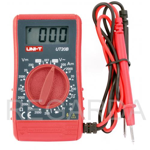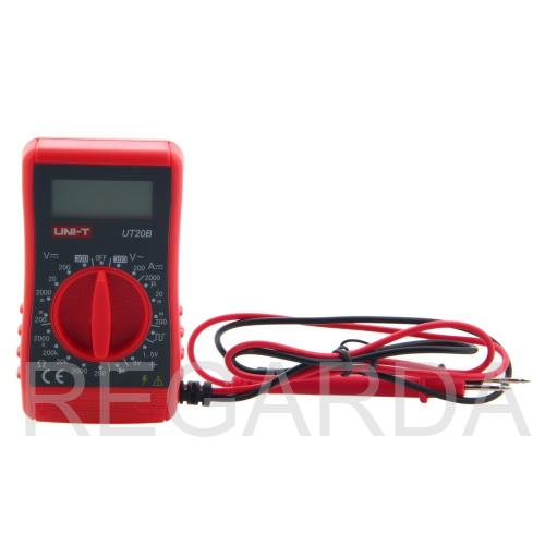 Портативный мультиметр UT20B подходит для измерения параметров напряжения, постоянного тока и сопротивления. Также с его помощью можно проводить тестирование батарей 1.5 В и 9 В, проверку диодов.