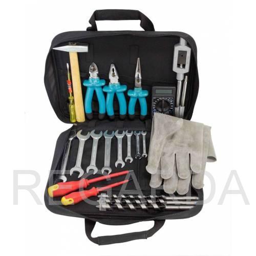 Набор состоит из рожковых ключей, изолированных длинногубцев, плоскогубцев и отверток, сверел по дереву, молотка, мультиметра.