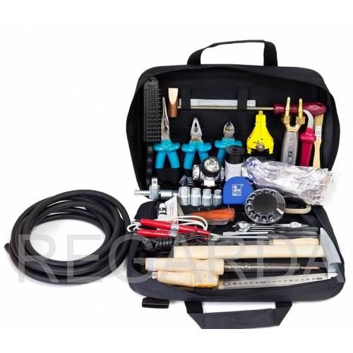 Набор включает в себя 38 предметов и состоит из изолированных плоскогубцев, кусачек и длинногубцев, отверток, пресс-клещей, кабельных ножей, ножовки по металлу, рожковых ключей, торцевых головок, газовой горелки и рукава высокого давления.