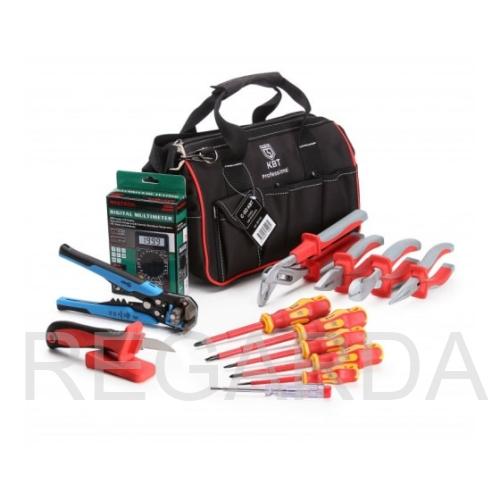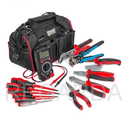 Изделия комплекта подойдут для снятия изоляции, монтажа и демонтажа резьбовых соединений, перекусывания проводов и кабелей, опрессовки, определения напряжения в сети.