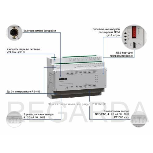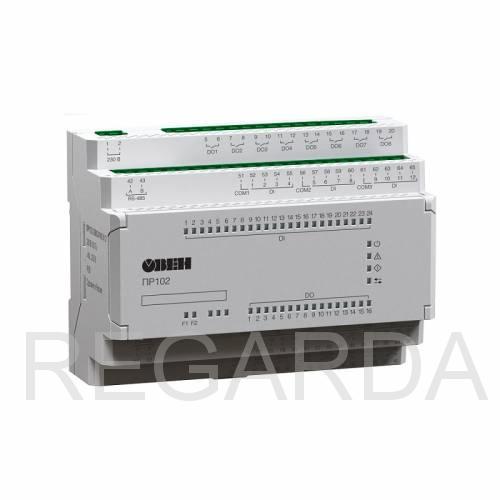 В корпусе 7DIN располагается 40 аналоговых и дискретных входов/выходов. Для расширения собственных входов/выходов предусмотрено подключение по внутренней шине модулей расширения ПРМ. В ПР102 может быть до 2-х интерфейсов RS-485 на борту: для управления устройствами по сети и передачи данных на верхний уровень. Написание алгоритма осуществляется пользователем на языке FBD с помощью бесплатной среды программирования OwenLogic. Загрузка алгоритма производится с помощью кабеля micro USB.