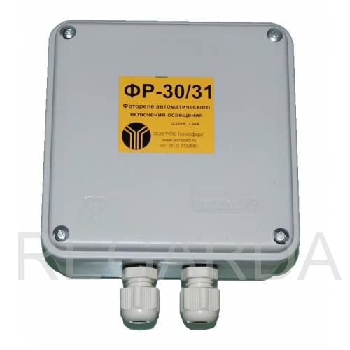 Смонтировано в герметичном корпусе. Фотореле ФР-30/31 имеет замыкающий контакт с током коммутации до 30 ампер. Датчик освещенности в выносном исполнении. Имеет заданные установки задержки включения/выключения 0, 30c, 1мин, 3мин, 10мин. Можно выбрать соответствующий режим нажатием на кнопку. При нулевой задержке устанавливается режим 1, а при задержке 10мин - режим 4. Одна контактная группы ("сухой" контакт) для коммутации нагрузки -30А.