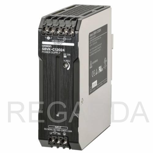 Импульсный источник питания серии s8vk-c, мощность 120 вт, входное напряжение 240 ~b, 350 =b, выходное напряжение 24 в, выходной ток 5 a, частота 50/60 гц (47..450 гц), защита от перегрузки, защита от повышенного напряжения/