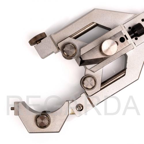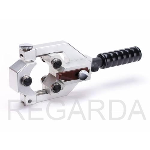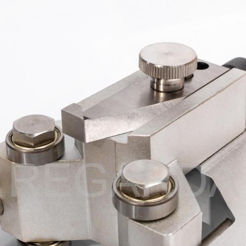 Конструкция модели КВТ КСП-65 имеет откидную планку с собственным фиксирующим винтом. Инструмент плавно регулируется для точной посадки роликов на кабель (осевым вращением рукояти) и для установки необходимой глубины реза (регулировочным винтом на каретке). Обкатка производится при помощи 6 роликовых деталей.