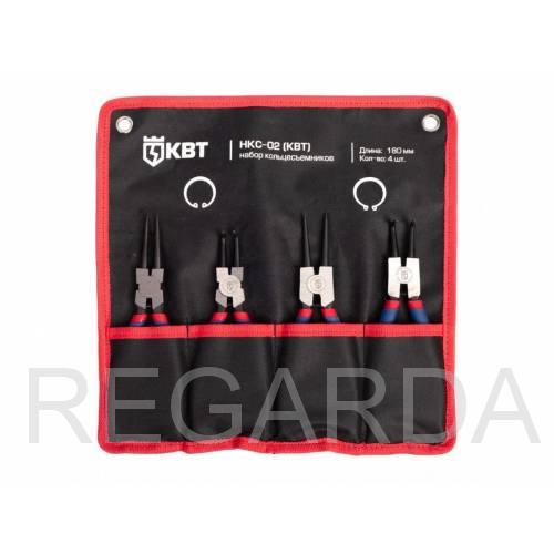 В состав набора НКС-02 (77443) входит инструмент для снятия как внутренних, так и наружных колец различного типа. Каждый съемник размещается в отдельном отсеке матерчатой сумки, которая имеет липучку для крепления и специальные отверстия для размещения на евростендах. Набор представлен самыми большими кольцесъемниками от КВТ серии МАСТЕР, для остальных колец предназначены съемники длиной 140 мм и набор НКС-01.