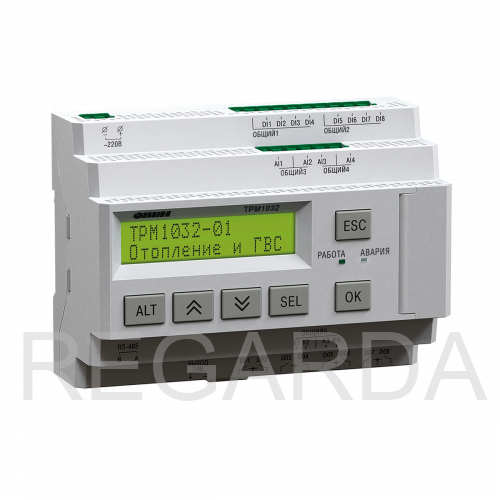 ТРМ1032 - контроллер с готовым алгоритмом регулирования температуры в системах отопления и ГВС. Предназначен для применения в индивидуальных и центральных тепловых пунктах (ИТП и ЦТП) и котельных. Регулятор отопления и ГВС поддерживает температуру по заданной уставке или отопительному графику, управляет запорно-регулирующим клапаном (КЗР), циркуляционными насосами, поддерживает давление системы, управляя контуром подпитки.