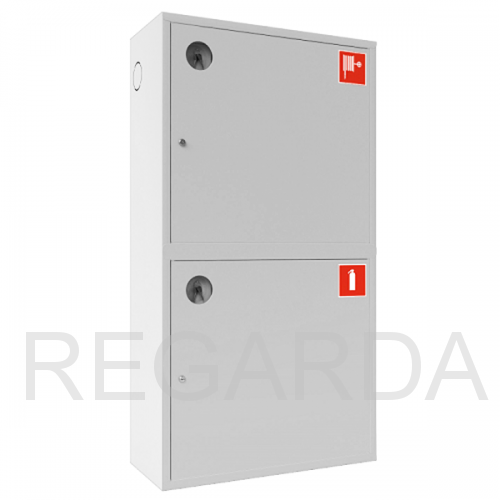 Состоит из двух вертикально ориентированных секций и служит местом хранения таких первичных средств пожаротушения, как огнетушители и комплекты пожарного крана (ПК). Изделие выполнено из листовой стали методом сварки и покрашено особой порошковой краской белого цвета. Для подведения противопожарного водопровода и монтажа на него пожарного крана (ПК) боковые стенки шкафа имеют перфорированные отверстия. Габариты секции для огнетушителей 700х650х300.