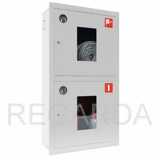 Состоит из двух вертикально ориентированных секций и служит местом хранения таких первичных средств пожаротушения, как огнетушители и комплекты пожарного крана (ПК). Изделие выполнено из листовой стали методом сварки и покрашено особой порошковой краской белого цвета. Для подведения противопожарного водопровода и монтажа на него пожарного крана (ПК) боковые стенки шкафа имеют перфорированные отверстия. Габариты секции для огнетушителей 700х650х300.