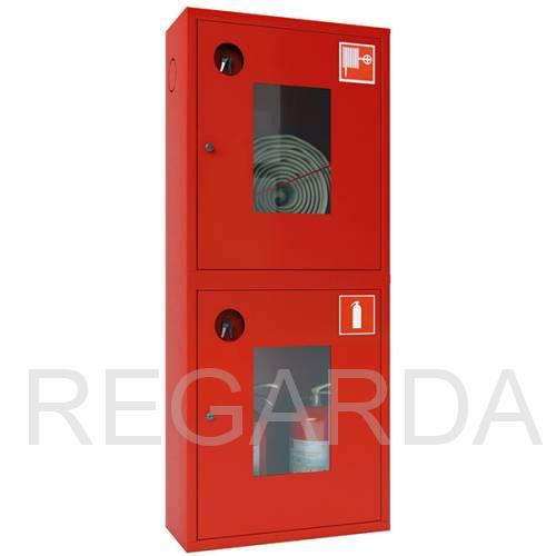 Используется для хранения первичных средств пожаротушения. В одном отсеке изделия размещается комплект пожарного крана, а в другом два огнетушителя (общей массой до 30 кг). Модель выполнена из листовой стали методом сварки и окрашена специальной порошковой краской красного цвета. Для подведения противопожарного водопровода и монтажа на него пожарного крана (ПК) боковые стенки шкафа имеют перфорированные отверстия. Габариты секции для огнетушителей 540х650х230.