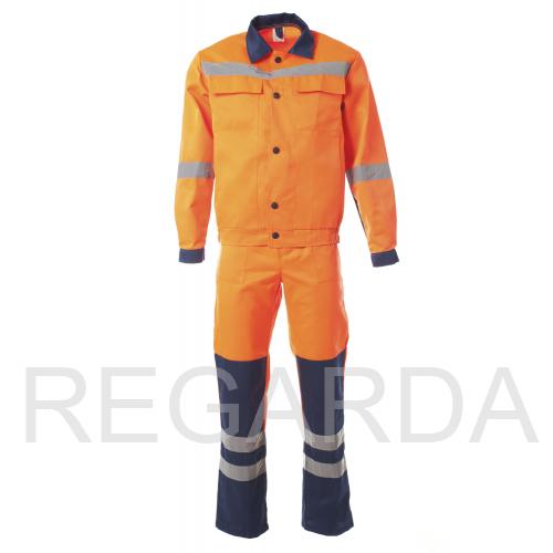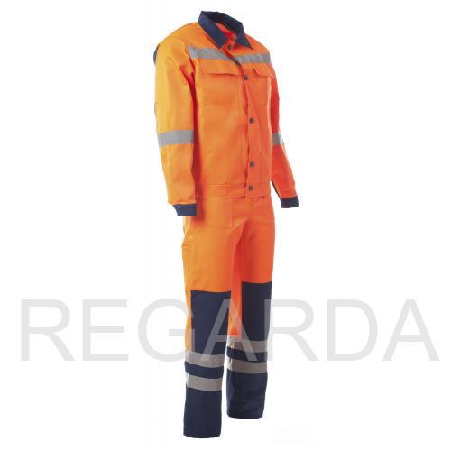 Костюм «МАГИСТРАЛЬ» с СОП изготовлен в соответствии с ГОСТ. На изделии расположены верхние карманы с клапанами и нижние карманы с вертикальным входом. Модель куртки выполнена в укороченном варианте на поясе с частичной стяжкой на эластичную резинку. В полукомбинезоне размещены многофункциональные карманы для хранения мелочей. Застежка гульфика и в правом боковом шве на пуговицы. По талии спинки расположена эластичная резинка для фиксации посадки. Бретели на пластиковых застежках (фастексах). Для безопасной работы сотрудника в местах с плохим освещением на костюме «МАГИСТРАЛЬ» с СОП предусмотрена световозвращающая полоса шириной 50 мм.