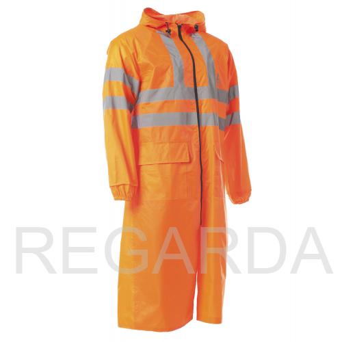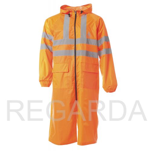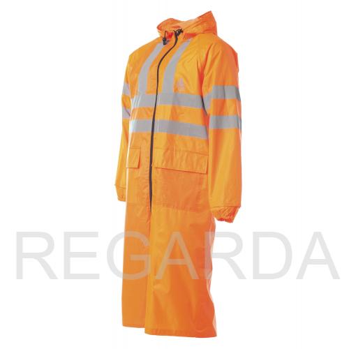 Плащ «ТАЙФУН с СОП» изготовлен в соответствии с ГОСТ и включает в себя два предмета: куртка / брюки. Он обеспечивает максимальную защиту от дождя, ветра, снега и загрязнений во время работы или активного отдыха, а также обеспечивает максимальную безопасность в условиях плохой видимости. Куртка прямого силуэта оснащена притачным капюшоном и отложным воротником. Пояс на резинке обеспечивает комфортную посадку. Центральная застежка на молнию скрыта за ветрозащитной планкой на кнопках. На куртке расположены два нижних кармана с влагозащитными клапанами для удобного хранения вещей. На капюшоне шнур с фиксаторами для более плотного прилегания. Рукава реглан с внутренними манжетами на резинке обеспечивают защиту от холода. Брюки прямого силуэта с эластичной тесьмой в притачном поясе и регулировкой по поясу шнуром с фиксаторами. Все швы на куртке и брюках проклеены специальной лентой, обеспечивающей 100% герметичность швов и защиту от «протечек». Для безопасной работы сотрудника в местах с плохим освещением на костюме «ТАЙФУН» с СОП предусмотрена световозвращающая полоса шириной 50 мм. Предполагаемая сфера применения: дорожные и коммунальные службы, городское хозяйство, транспорт, работа на открытом воздухе в условиях плохой видимости.