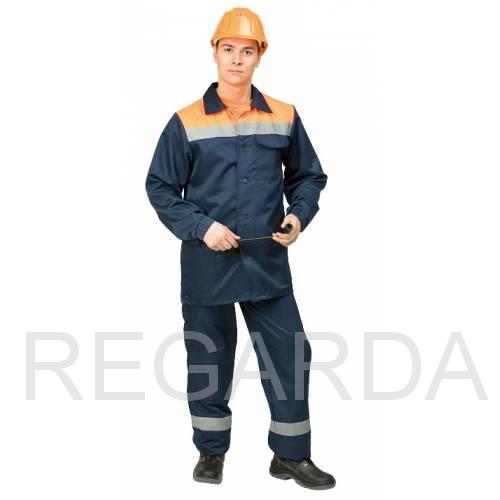 Состоит из куртки и брюк. Куртка с застежкой на пуговицы. На костюме усиление в области локтей и коленей, световозвращающие полосы.