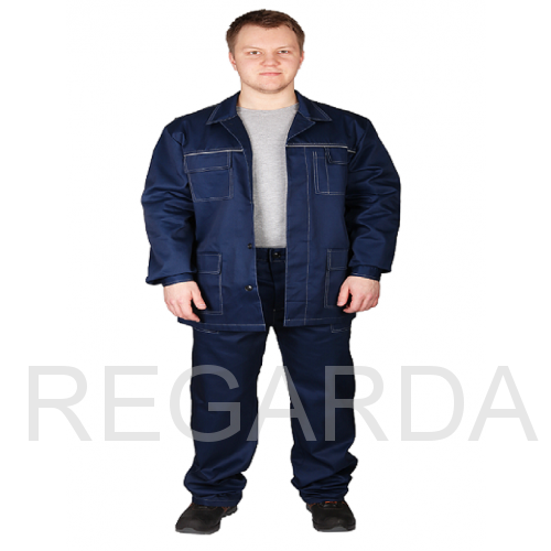 Состоит из куртки и брюк. Куртка прямая, с застежкой на пуговицы, с двумя нижними и нагрудным накладными карманами. На груди и спине светоотражающий кант. Брюки с передними накладными карманами.