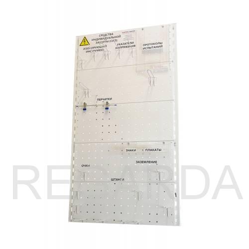 Стенд ELMA107 для хранения СИЗ настенный металлический предназначен для создания условий хранения средств индивидуальной защиты, применяемых в электроустановках, в соответствии с требованиями инструкции СО 153-34.03.603-2003 по применению и испытанию.