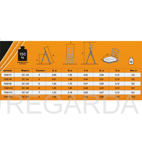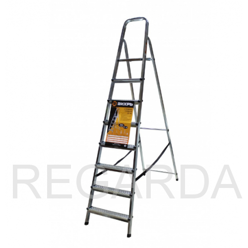 Прочный корпус изготовлен из стали. Покрыта гальваническим антикоррозийным покрытием. Односекционная модель с 7-ю широкими ступенями с рифленой поверхностью и рабочей площадкой. Чтобы стремянка не скользила, на опорах оборудованы заглушки. Также есть дуга безопасности. В сложенном состоянии модель очень компактна и занимает мало места.