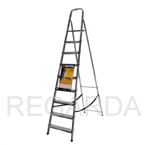 Прочный корпус изготовлен из стали. Покрыта гальваническим антикоррозийным покрытием. Односекционная модель с 8-ю широкими ступенями с рифленой поверхностью и рабочей площадкой. Чтобы стремянка не скользила, на опорах оборудованы заглушки. Также есть дуга безопасности. В сложенном состоянии модель очень компактна и занимает мало места.
