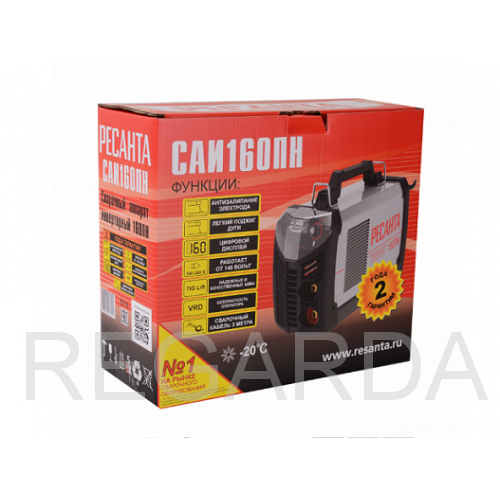 Ресанта САИ 160ПН – инверторный прибор, адаптированный для работы от однофазной сети питания с пониженным напряжением (колебания в пределах от 140 до 240 В). Это способствует эффективной функциональности и что наиболее важно – высокому качеству сварного шва.