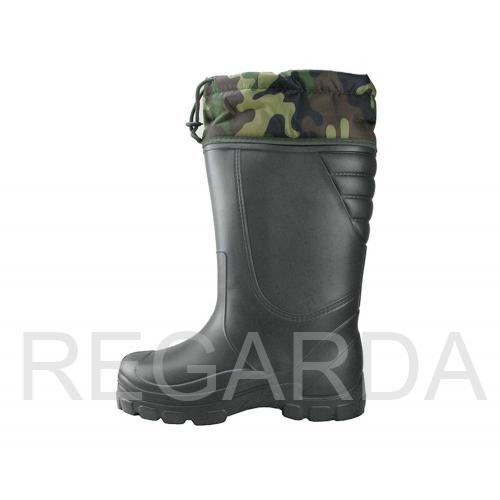 В сапогах ЭВА "АРКТИКА" расположен клапан-манжет, выполненный из водоотталкивающей ткани (Оксфорд) с возможностью регулировки по ноге. Внутри сапог 5-слойный сменный вкладыш (чулок), льняное полотно, ППУ (пенополиуретан), полушерстяной мех. Фольгированная сетка сохраняет тепло. Сапоги ЭВА «АРКТИКА» рассчитаны на эксплуатацию при экстремально низких температурах (до -70С).