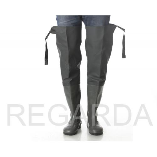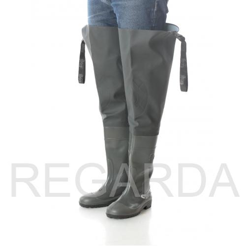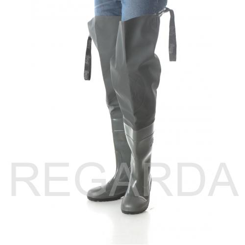 Сапоги ПВХ рыбацкие регулируются по длине на бретелях. Верхняя часть герметично соединена с сапогами. Модель изготавливается на базе рабочих сапог. Изделие полностью водонепроницаемо. Наколенники выполнены из винтитола и поролона. На заказ сапоги могут быть изготовлены с металлическим защитным носком (Мун 200) и проколозащитной металлической стелькой (1200 Н).