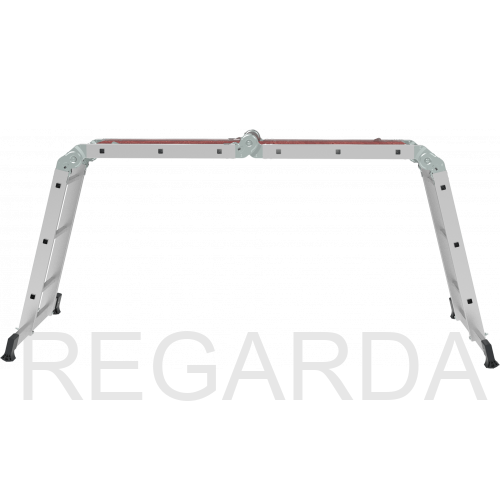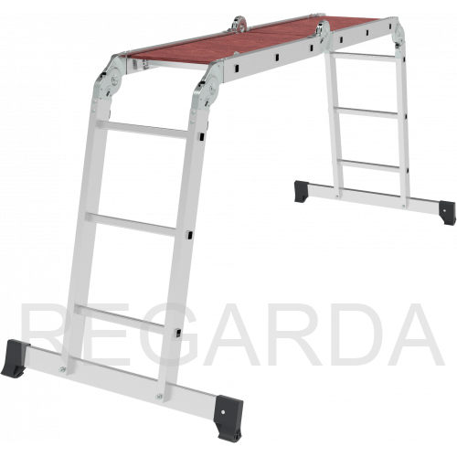 Многофункциональная шарнирная лестница «4 в 1» для бытового использования: приставная, Г-образная с опорой на стену, двухсторонняя стремянка, помост со съёмным настилом.