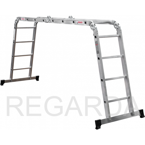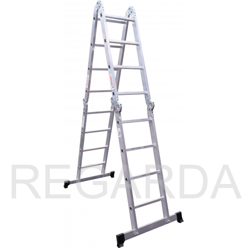 Многофункциональная улучшенная шарнирная лестница «4 в 1» увеличенной шириной для бытового использования с повышенными нагрузками: приставная, Г-образная с опорой на стену, двухсторонняя стремянка, помост.