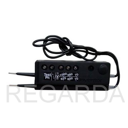 Для ступенчатого контроля напряж. 70, 600, 825 В постоян. и 70, 380, 1000 В перемен. тока. Определяет фазу перемен. и полярность постоян. тока, целостность эл. цепей от 0 до 1 мОм. Индикация светозвуковая.