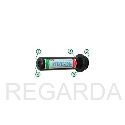 Внешний вид УПУН представлен на рис. 1. В пылезащищенном противоударном стеклопластиковом цилиндрическом корпусе 1 размещены генератор высоковольтных импульсов и источник питания с временем хранения не менее 8 лет. Торцы корпуса 1 снабжены контактным электродом 2, кнопкой включения 3 и светодиодным индикатором 4, который обеспечивает как индикацию включенного состояния, так и функции фонаря.