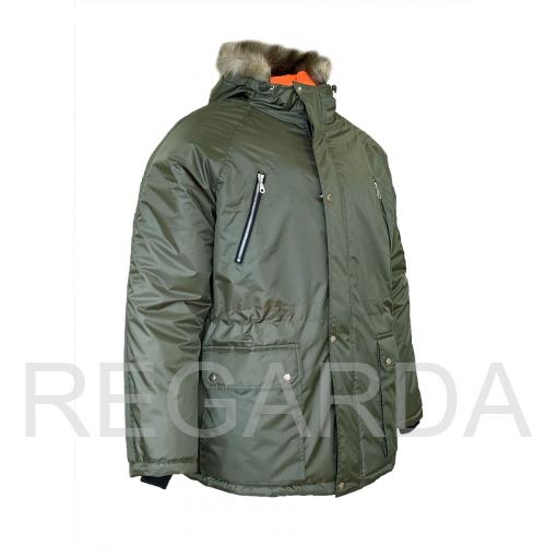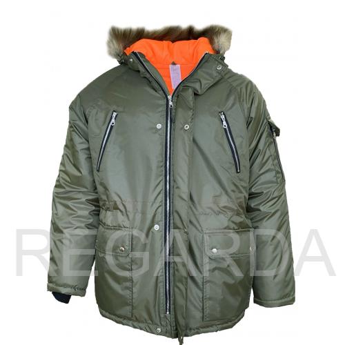 Куртка "Аляска" изготовлена в соответствии с ГОСТ. Модель имеет удлиненный фасон на поясе, дополнена эластичной резинкой для комфортной посадки. Ветрозащитная планка на кнопках обеспечивает дополнительную защиту от ветра. Капюшон пришит к куртке и оснащен съемной меховой опушкой, что позволяет варьировать его использование в зависимости от погодных условий и предпочтений.
