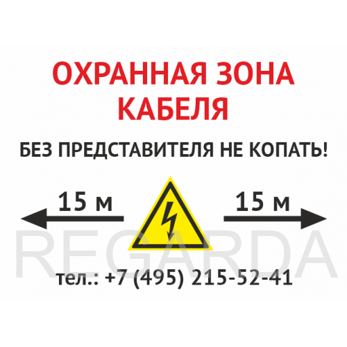 Знак «Охранная зона кабеля. Без представителей не копать», OZK-02 на 2-мм пластике, размером 400х300 мм устанавливается для обозначения зоны залегания кабеля в местах его пересечения с автомобильной дорогой и другими коммуникациями. Знак должен быть установлен на определенном расстоянии от земли – на высоте человеческого роста (1,7 м). На нем обязательно размещение таких данных, как адрес и телефон эксплуатирующего линию предприятия, размеры охранной зоны
