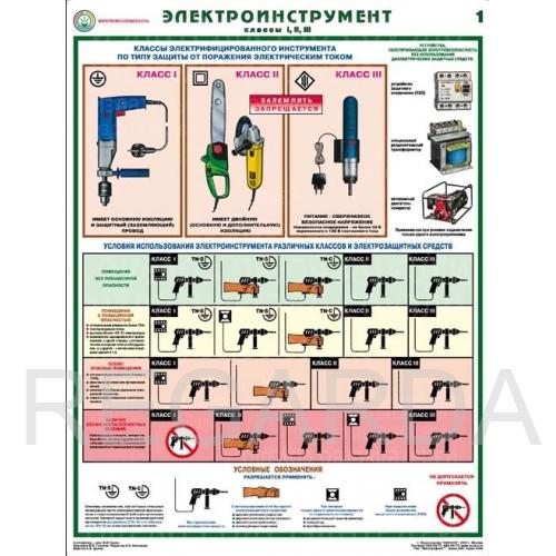 - 1 Плакат – Классы электрифицированного инструмента по типу защиты от поражения электрическим током, условия использования электроинструмента различных классов и электрозащитных средств
