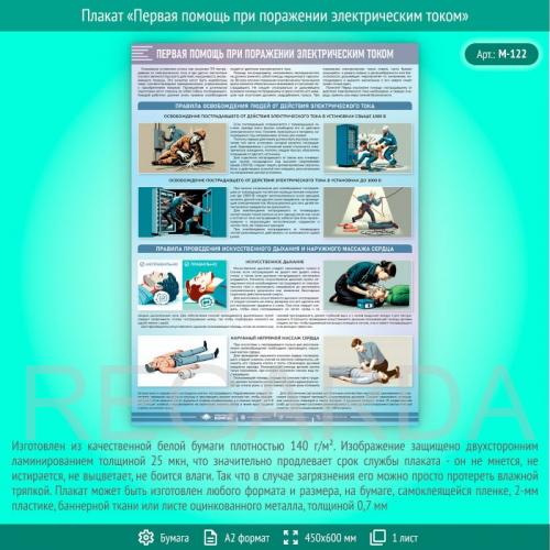 Плакат «Первая помощь при поражении электрическим током» (М-122) описывает порядок оказания первой доврачебной помощи при поражении электрическим током.