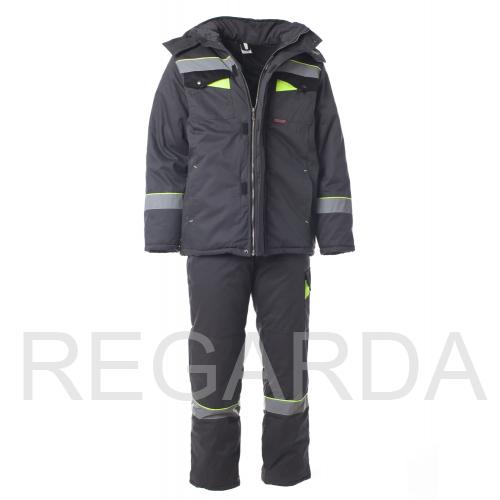 Костюм утепленный "КОРВЕТ" изготовлен в соответствии с ГОСТ и включает в себя 2 предмета: куртка / брюки. Центральная застёжка - молния "металл №5". На куртке ветрозащитная планка с застежкой на липучки и кнопки. На модели расположены нагрудные накладные карманы и карманы в рельефных швах полочек. Ширина изделия регулируется по низу. Костюм оснащен утепленным съемным капюшоном с козырьком. На брюках съёмные бретели, широкий утепленный пояс закрывается на пуговицы. На изделии расположены многофункциональные карманы для хранения мелочей. Гульфик закрывается на молнию. В области колен усилительные накладки. В костюме присутствуют яркие декоративные элементы. В области колен усилительные накладки. Для безопасной работы сотрудника в местах с плохим освещением на костюме «КОРВЕТ» с СОП предусмотрена световозвращающая полоса шириной 50 мм.