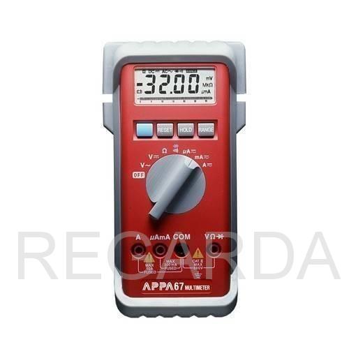 APPA 67 имеет компактный корпус, выполненный из ударопрочных и влагостойких материалов, который повышает удобство работы. Компания-производитель поставляет аппарат вместе 2-мя измерительными щупами, батареями, футляром, зажимами типа "крокодил".